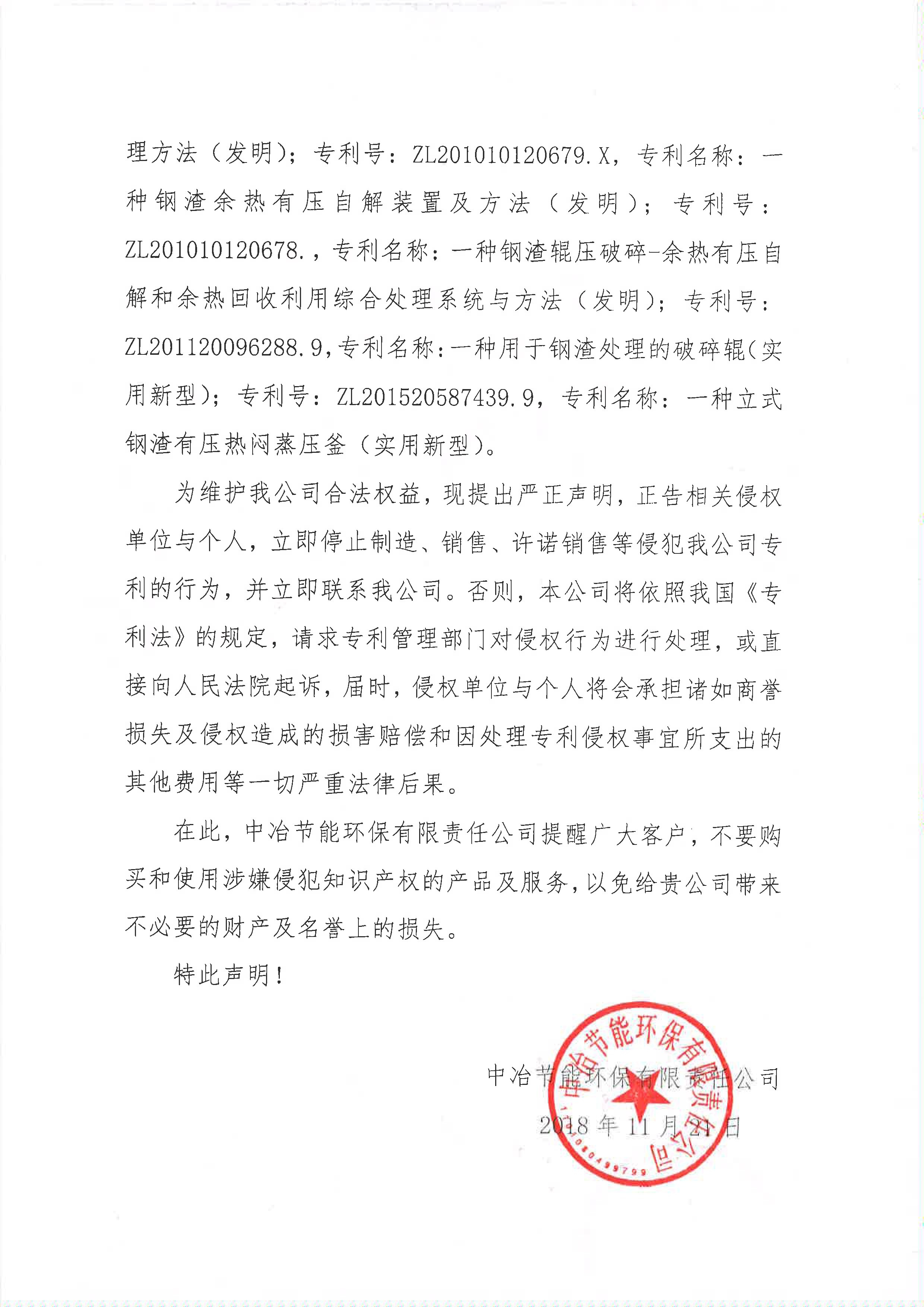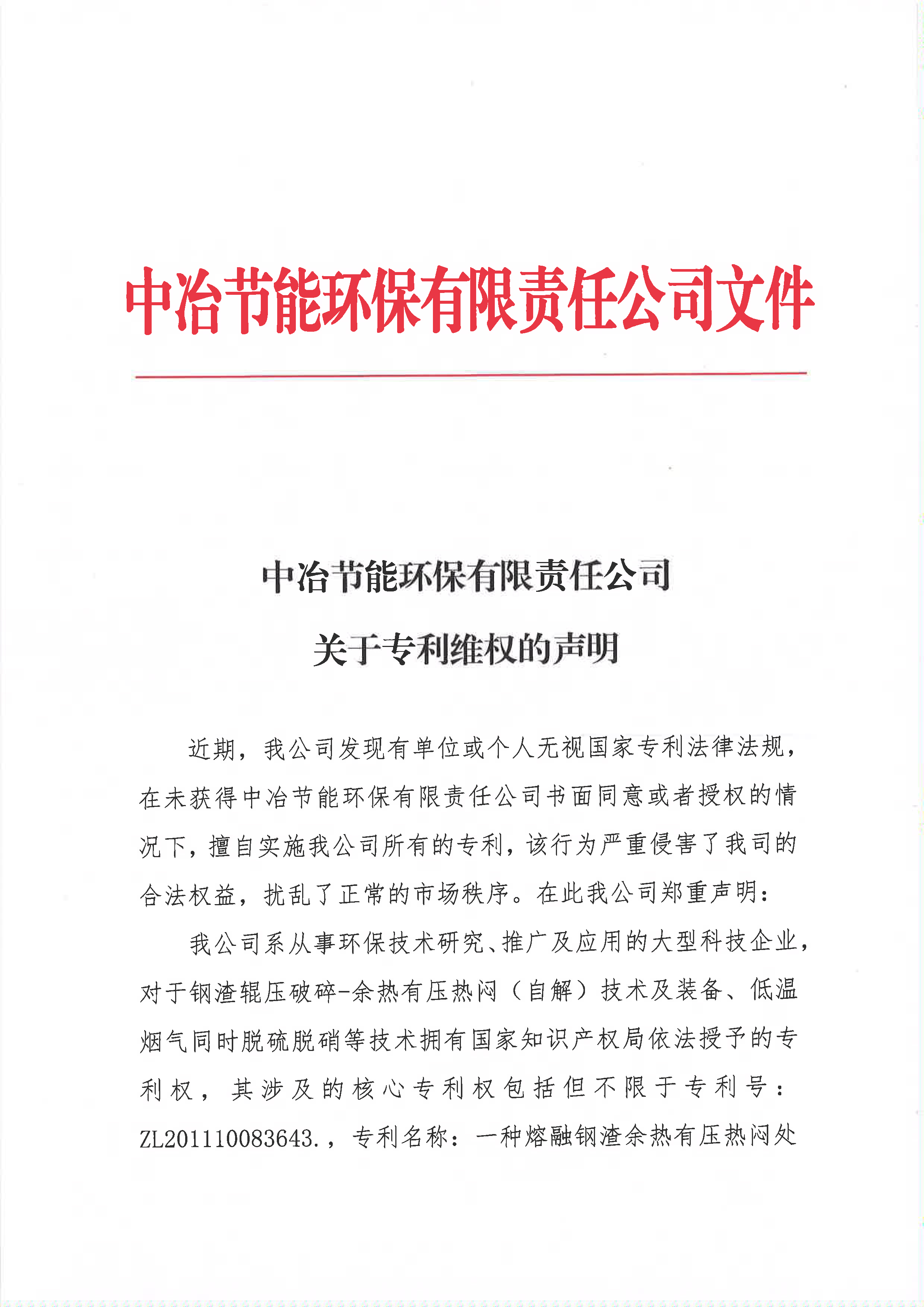 中冶節能環保有限責任公司關于專利維權的聲明